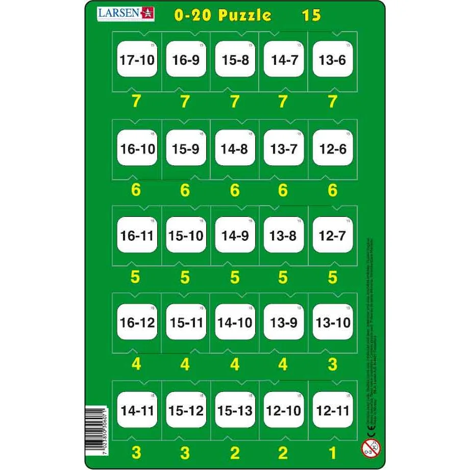 Setul contine 16 puzzle-uri cu adunarea si scaderea de la 0 la 20. Pe fiecare piesa de puzzle este cate o problema aritmetica. Rezolvati problema si plasati piesa in dreptul raspunsului corect. Piesa nu se va potrivi in cazul in care raspunsul este gresit. Puzzle-urile Larsen au o plansa cu margini permanente pentru a-i fi copilului mai usor sa se joace si pentru o depozitare usoara. Puzzle-urile sunt confectionate din carton gros. Acest lucru permite copilului sa apuce mai bine piesele si sa nu se rupa. Numar piese : 25. Dimensiune : 28.5x18.3 cm. Interzis copiilor sub varsta de 3 ani. Fabricat in Norvegia din carton reciclat.